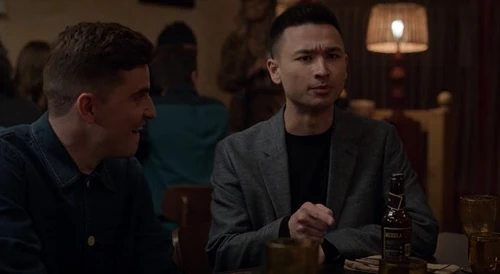 Michael returns home and goes to see Colin at the opening of Sam Obisanya's restaurant Ola's, and is introduced as Colin's "friend/wingman." It is evident that they have agreed to keep their relationship secret as Michael plays along, telling a story about how bad Colin is at flirting with women to Thierry Zoreaux and Isaac McAdoo. After dinner, Michael and Colin are passionatley kissing a few blocks from the restaurant. They are in their own world, kissing each other, not knowing that Trent Crimm accidentally spots them together when he is walking home from the restaurant.